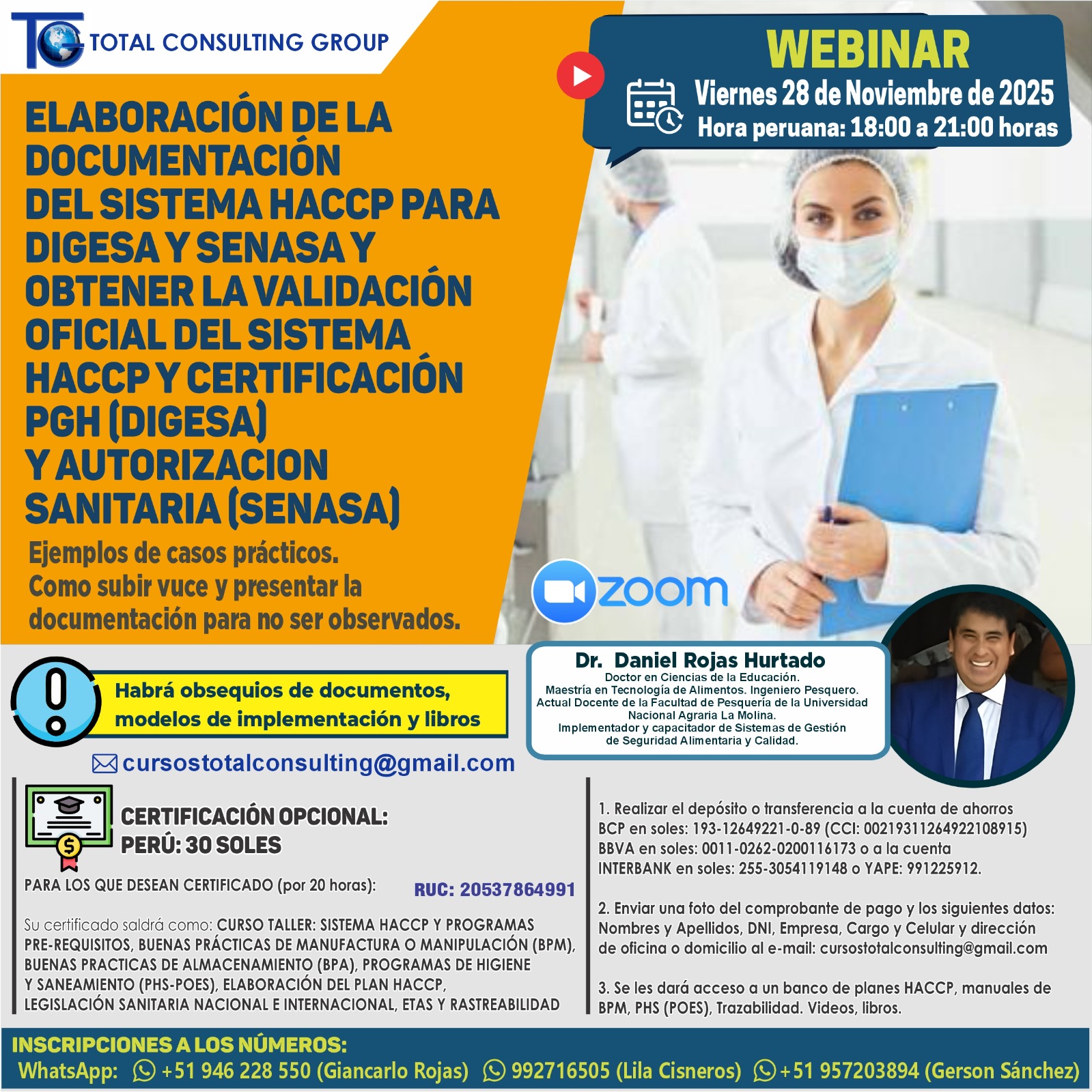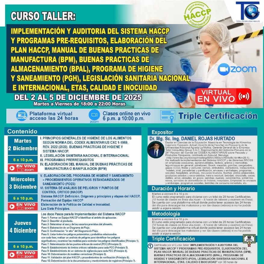 Implementación y auditoria del sistemas HACCP y programas pre-requisitos, elaboración del plan HACCP, manual de buenas practicas de manufactura, buenas practicas de almacenamiento, programa higiene y saneamiento, legislación sanitaria nacional e internacional, etas, calidad e inocuidad
