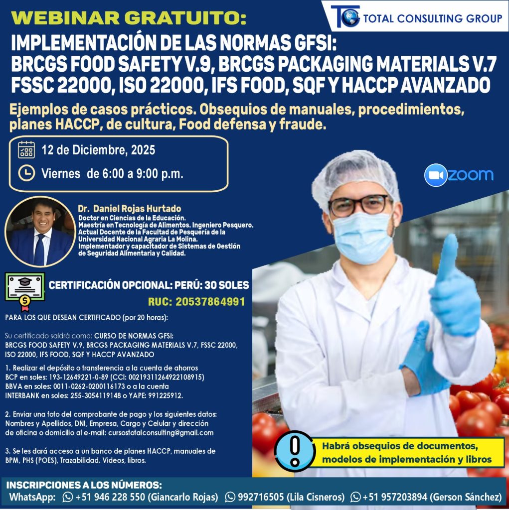 IMPLEMENTACIÓN DE LAS NORMAS GFSI: BRCGS FOOD SAFETY V.9, BRCGS PACKAGING MATERIALS V.7, FSSC 22000, ISO 22000, IFS FOOD, SQF Y HACCP AVANZADO